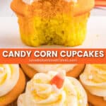 Add a pop of color to your dessert table with Candy Corn Cupcakes! 🎃 Simple, buttery cupcakes topped with white frosting and candy corn!