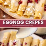 There are so many ways to use eggnog in cooking, but these crepes are one of my favorites. Whether you’re looking for recipes to use up eggnog after Christmas or trying to decide how to use up eggnog before it expires, these crepes make the perfect solution.