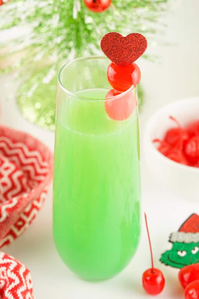 Holiday brunch needs a Grinch Mimosa. Easy, bubbly, and so cute with its green color and cherry topper. A fun Christmas drink idea! 💚🍒