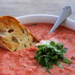 time. - Remove from heat and serve soup, garnish with basil, cheese and bread if desired.