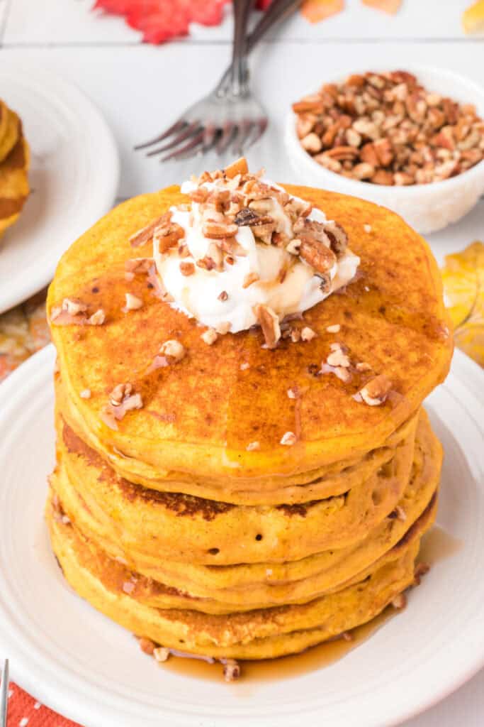 Try maple syrup, caramel drizzle, whipped cream, toasted pecans, or even a dollop of cream cheese frosting for dessert-style pancakes.