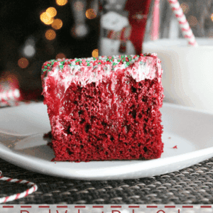 Is there another cake that says Christmas quite like Red Velvet?! I think not! This is one of many poke cakes in my poke cake obsession. With Christmas just days away, I wanted to share and easy, but festive idea. Since this easily feeds a lot, it’s perfect for gatherings with friends and family!