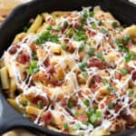 After the fries come out of the oven, immediately drizzle with cheese sauce. Sprinkle with bacon. Drizzle with sour cream. Sprinkle with green onions.